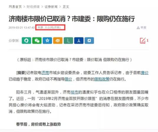 3月21日中午,济南大众网报道了关于“济南楼市限价政策取消”的消息,随后,这条新闻就被各大财经媒体转载,然后就在网络上刷屏,后来经过反复确认后,济南方面相关人员确定了这个消息,并且强调“限购政策”继续实行。