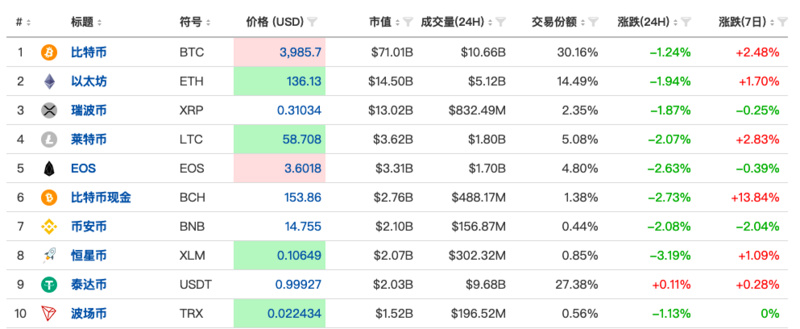 比特币 BTC 报 3985.7 美元,7 日内涨跌幅 +2.48 %;