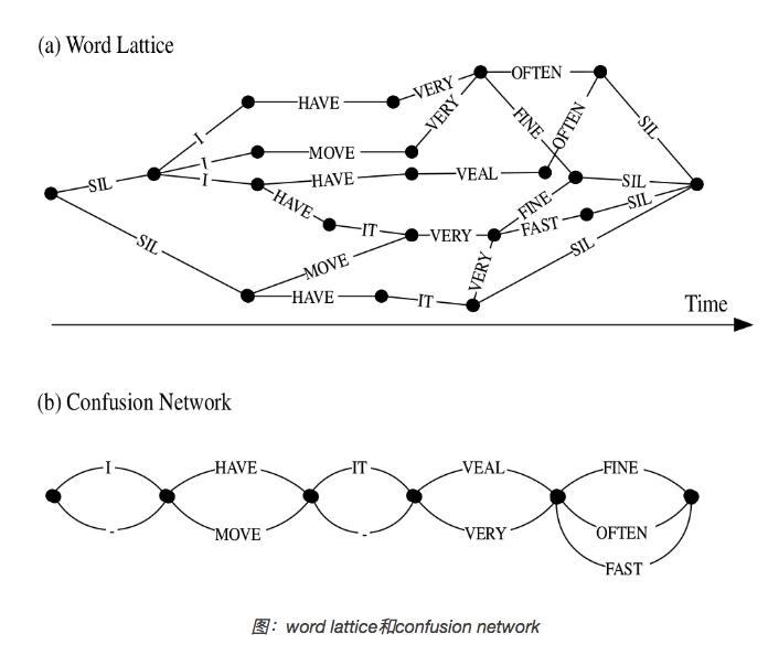 我们也可以把word lattice表示成更加紧凑的confusion network,如下图b所示。图中”-“表示空跳转。在confusion network中,点并不严格表示时间顺序,因此平行的边(起点和终点都相同的边)不代表它们的开始时间或结束时间相同。但是大多数时候,我们可以认为平行的边代表它们对应的词是一种竞争关系,比如图中的HAVE和MOVE。confusion network保证:对于lattice中的每一条路径,在confusion network中都有一条对应的路径。confusion network中的边上一般会有一个与边上词相关的一个后验概率,它是通过在word lattice中使用前向后向算法计算出来概率,然后把平行边的概率归一化了。