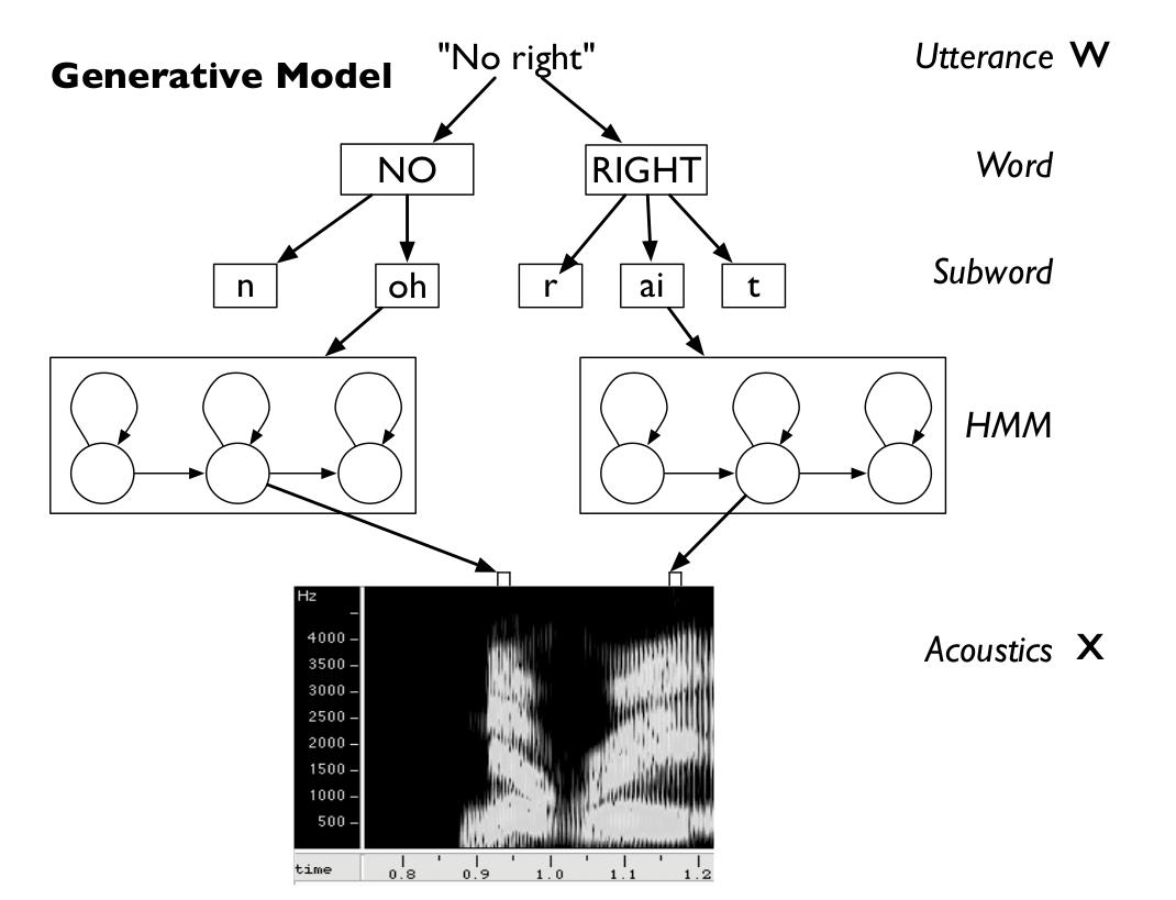 发声过程从上到下输入是utterance W,输出是声学特征X。而识别的过程正好反过来,我们需要寻找:
