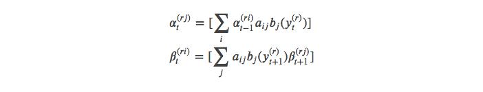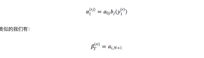 我们可以这样“读”第一个公式:t时刻处于状态j,那么可以是t-1时刻属于状态i,然后从状态i跳到j(𝑎𝑖𝑗aij),并且t时刻从状态j输出(发射)𝑦(𝑟𝑗)𝑡yt(rj)(𝑏𝑗(𝑦(𝑟)𝑡)bj(yt(r)))。第二个公式也是类似的,不过它是从后往前的。