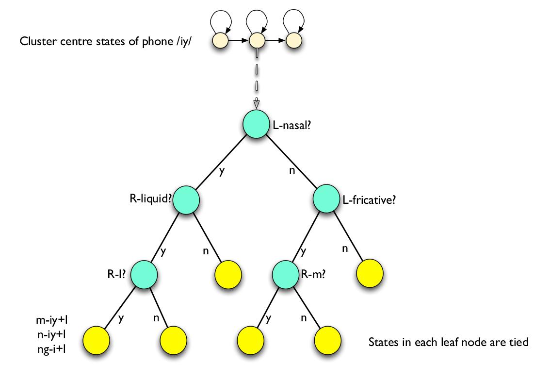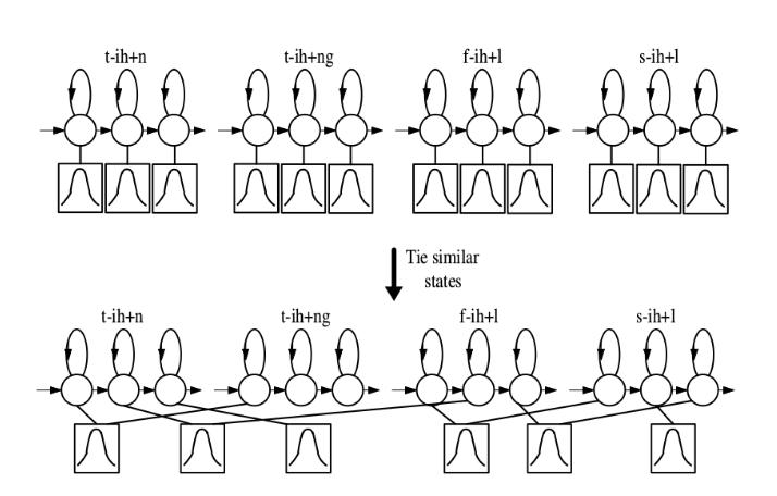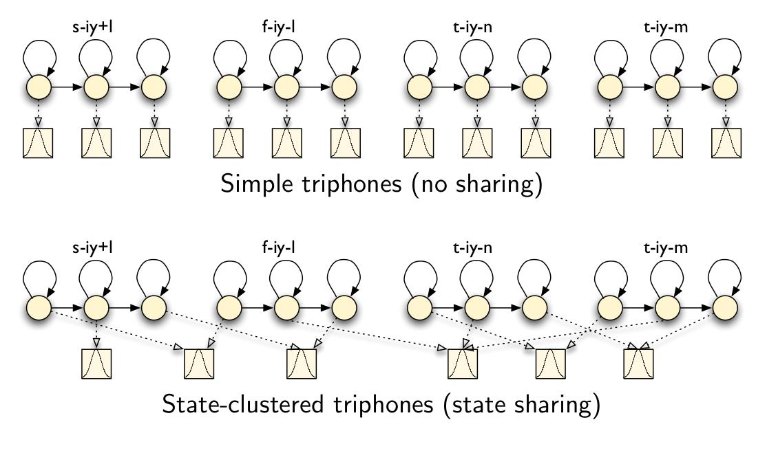 前面我们说到为了避免数据稀疏,我们通常会对triphone进行聚类,一种最简单的聚类是直接对所有的triphone进行聚类。但是通常triphone的每个因子都有3个状态,分别表示这个音的开始部分、中间部分和结尾部分。我们也可以更加细粒度的对状态进行聚类,这样的效果会更好。聚类的结果如下图所示,属于不同的triphone的类似状态会聚类在一起,这些状态是绑定(tie)在一起的,我们在参数更新是修改任何一个的时候也会等价于修改其它的(实际实现的时候就是一个共享的状态)。
