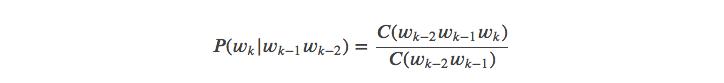 N-Gram语言模型可以通过最大似然方法来估计参数,假设𝐶(𝑤𝑘−2𝑤𝑘−1𝑤𝑘)C(wk−2wk−1wk)表示3个词(𝑤𝑘−2𝑤𝑘−1𝑤𝑘(wk−2wk−1wk连续出现在一起的次数,类似的𝐶(𝑤𝑘−2𝑤𝑘−1C(wk−2wk−1表示两个词𝑤𝑘−2𝑤𝑘−1wk−2wk−1连续出现在一起的次数。那么: