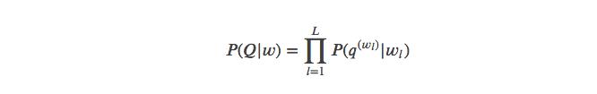 上式中,𝑞(𝑤𝑙)q(wl)是词𝑤𝑙wl的一种合法的发音,通常情况下一个词只有一种发音,但是有些词会有多种发音,因此𝑃(𝑌|𝑤)P(Y|w)会遍历词序列w的所有可能发音序列Q。