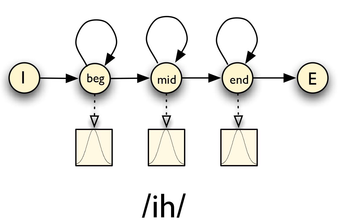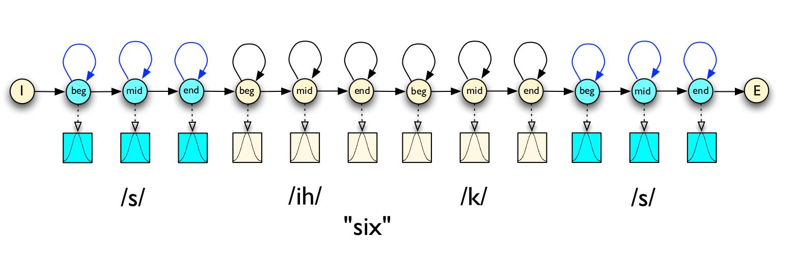 这样给定一个词,我们就知道它的音子序列,然后我们通过把每个音子的HMM拼接起来就可以得到这个词的HMM,类似的我们把很多词的HMM拼接起来就可以得到一个句子的HMM。