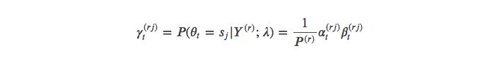 我们首先定义前向概率𝛼𝑟𝑗𝑡=𝑃(𝑌𝑟1:𝑡,𝜃𝑡=𝑠𝑗;𝜆)αtrj=P(Y1:tr,θt=sj;λ),它的意思是t时刻的状态为j并且1到t时刻输出为𝑌𝑟1:𝑡Y1:tr的联合概率。而后向概率𝛽𝑟𝑖𝑡=𝑃(𝑌(𝑟)𝑡+1:𝑇(𝑟)|𝜃𝑡=𝑠𝑖;𝜆)βtri=P(Yt+1:T(r)(r)|θt=si;λ),它的意思是t时刻状态为i的条件下t+1到T时刻的输出为𝑌𝑟𝑡+1:𝑇Yt+1:Tr的条件概率。注意这两个概率的区别,一个是联合概率一个是条件概率。