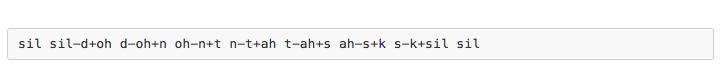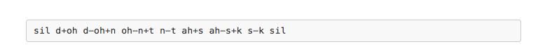 但是一个音子在不同的上下文会有不同的发音,这就是所谓的协同发音(Coarticulation)。为了解决这个问题,我们通常建立上下文相关的音子模型,最常见的就是考虑一个音子的左右两个音子,这就是triphone模型。我们通常使用类似l-x+r来表示当前考虑的音子是x,它左边的音子是l而右边是r。根据triphone是否跨越词的边界又可以分类为词内的(word-internal) triphones和跨词的(cross-word) triphone。比如句子”don’t ask”,如果使用词内的triphone,则可以表示为: