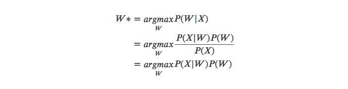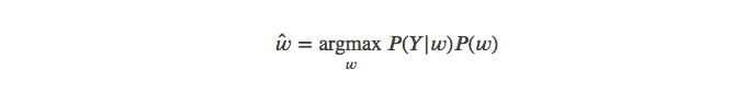 因为𝑃(𝑤|𝑌)P(w|Y)比较难于直接建模,因此我们使用贝叶斯公式,因为分母与w无关,因此可以得到: