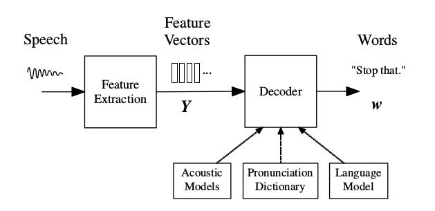 基于HMM的语音识别系统架构如下图所示。来自麦克风的音频波形被转换成固定大小(比如39维的MFCC)的声学特征向量的序列𝑌1:𝑇=𝑦1…𝑦𝑇Y1:T=y1…yT,这个过程叫做特征提取。然后解码器(decoder)试图找到最优的词序列𝑤1:𝐿=𝑤1…𝑤𝐿w1:L=w1…wL使得后验概率最大: