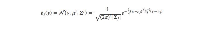 其中𝜇𝑗μj是状态j的高斯分布的均值,而Σ𝑗Σj是协方差矩阵。因为y的维度通常比较高(比如39),我们通常假设Σ𝑗Σj是对角矩阵(Diagonal Matrix)。之前我们在介绍特征提取的时候,MFCC的一个步骤就是DCT去除不同维度的相关性,从而使得这个假设能够成立。