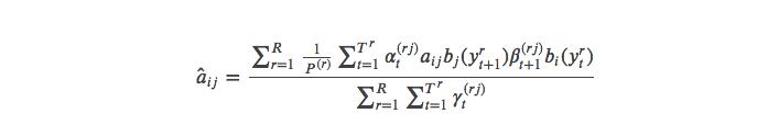 假设我们知道t时刻对应的状态的概率(当然如果认为一个时刻只能“属于”某一个状态,那么它就是类似one-hot的——一个1其余的是0)𝛾(𝑟𝑗)𝑡γt(rj),这个概率表示(第r个训练数据)t时刻的状态是j的概率,我们通常把它叫作(状态)占用(occupation)概率。那么我们很容易用如下公式最大似然估计𝑎𝑖𝑗和𝑏𝑗(𝑦)aij和bj(y):