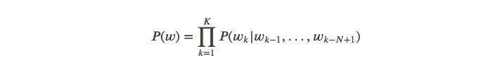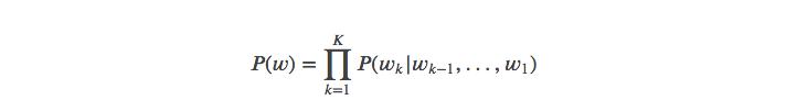 给定词序列𝑤1,…,𝑤𝐾w1,…,wK,语言模型会计算这个序列的概率,根据条件概率的定义,我们可以将联合概率分解为如下的条件概率: