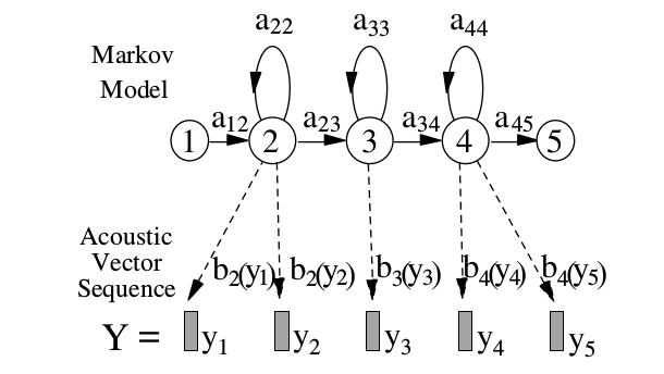 每个基本因子q由一个连续输出的HMM来表示,如下图所示。图中有一个进入状态和退出状态,它是没有输出的,这两个状态是为了方便把不同词的HMM串联起来。每个因子q的HMM由两个状态𝑎𝑖𝑗aij和𝑏𝑗(𝑦)bj(y)来表示,其中𝑎𝑖𝑗aij表示由状态i跳转到j的概率;𝑏𝑗bj表示在这个状态j下输出𝑦y的概率(分布/密度)。HMM的基于如下两个独立性的假设: