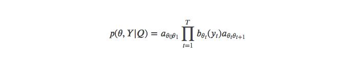 在上式中𝜃0θ0和𝜃𝑇+1θT+1是进入(entry)和退出(exit)状态,它们是没有输出的。它们的目的是为了方便把不同词的HMM串联起来。后面为了简单,我们可以暂不考虑它们,而只关注𝜃1,…,𝜃𝑇θ1,…,θT。