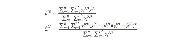 上面的公式看起来很复杂,其实它表达的意思很简单:我们要估计状态j对应的高斯分布的均值,那么我们找到所有属于这个状态的时刻t(𝛾(𝑟𝑗)𝑡γt(rj)),然后把它们平均起来就行,不过这里因为我们认为某个时刻可能有一定的概率属于状态j,所以我们需要加权上概率𝛾(𝑟𝑗)𝑡γt(rj)。如果我们考虑特殊情况——一个时刻t只属于一个状态j,那么上面的公式会更加明显。Σ̂ (𝑗)Σ^(j)的估计公式其实也是类似的。
