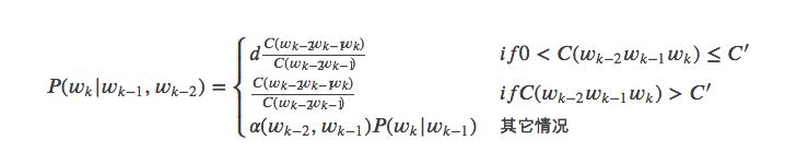 上式中C’是一个阈值,频次高于它的概率和最大似然估计一样,但是对于低于它(但是至少出现一次)的概率做一些打折,然后把这些概率分配给没有出现的3-Gram,怎么分配呢?通过回退到2-Gram的概率𝑃(𝑤𝑘|𝑤𝑘−1)P(wk|wk−1)来按比例分配。