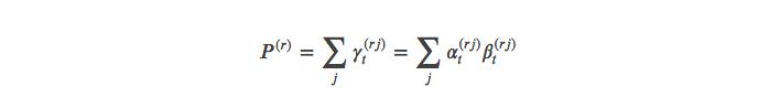 这里不详细推导这个公式,我们可以这样来“理解”:t时刻处于状态j的概率是所有1到t时刻的输出是𝑌1:𝑡Y1:t并且t时刻状态是j的联合概率(𝛼(𝑟𝑗)𝑡αt(rj))和在t时刻状态为j的条件下t+1到T时刻的输出是𝑌𝑡+1:𝑇Yt+1:T的条件概率(𝛽(𝑟𝑗)𝑡βt(rj))的乘积,而𝑃(𝑟)P(r)是一个归一化的因子,使得𝛾(𝑟𝑗)𝑡γt(rj)是一个概率,也就是∑𝑗𝛾(𝑟𝑗)𝑡=1∑jγt(rj)=1,因此: