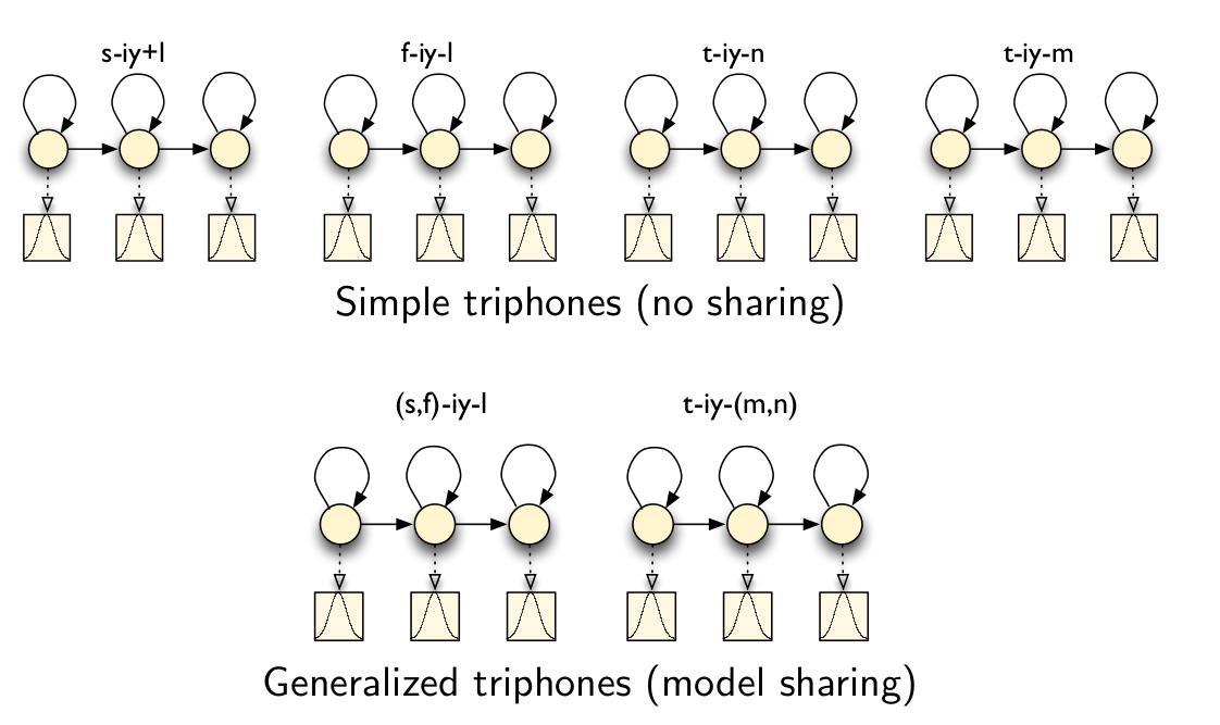 为了加入上下文的信息,我们通常使用triphone,也就是把这个因子的前后的因子也考虑进来组合成一个triphone。假设基本的因子有N个,那么理论上的triphone个数是𝑁3N3个(当然实际某些组合是在训练数据中没有出现过的)。因为triphone很多,这会导致数据稀疏的问题,因此我们通常类似的triphone聚类在一起。
