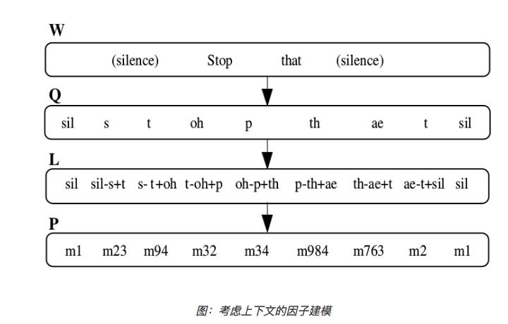 如图上图所示,W代表词序列,Q代表发音序列,L代表triphone序列,而P代表HMM模型的序列。这里的triphone我们用x-q+y的形式来表示,比如s-t+oh,表示中心的因子是t,它的左边是s右边是oh。注意stop that的p,在图中是oh-p+th,p所在的词是stop,而它的右方上下文是that的th,这种跨越词边界的triphone叫crossword triphone。也有triphone的建模是不跨越词边界的。