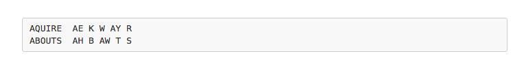为了解决上面的问题,我们通常对更细粒度的子词单元进行HMM建模。虽然词很多,但是组成词的因素是不多的,比如英语的音素也就是四五十个左右。因此我们可以对每一个phone建立一个HMM模型,而词的HMM就可以使用它的phone的HMM拼接起来。当然这就需要知道每个词由哪些phone组成,最常见的是人工来编纂发音词典,比如下面是CMU发音词典的两个词: