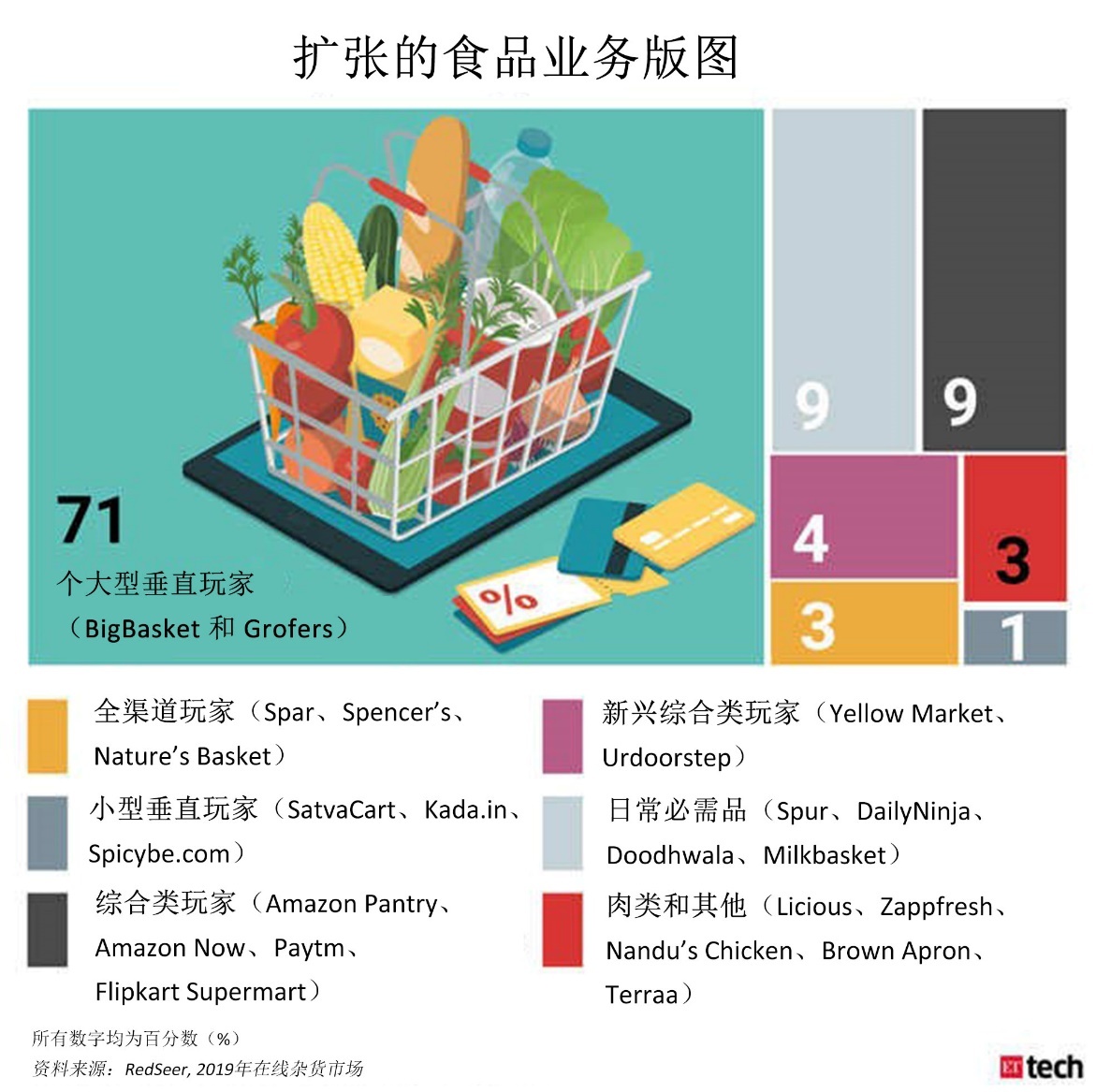 食品杂货被誉为电子商务的下一个风口,吸引了多家大型线上甚至线下玩家投入数十亿美元来培养市场。投资者之所以看好这一领域,很大程度上与印度整体零售市场的结构有关--根据 Forrester 的数据,食品杂货占印度整体零售支出的61%以上,在2018年达到了5400亿美元。目前,线上的食品杂货销售额约为12亿美元,因此还有很大的增长空间。