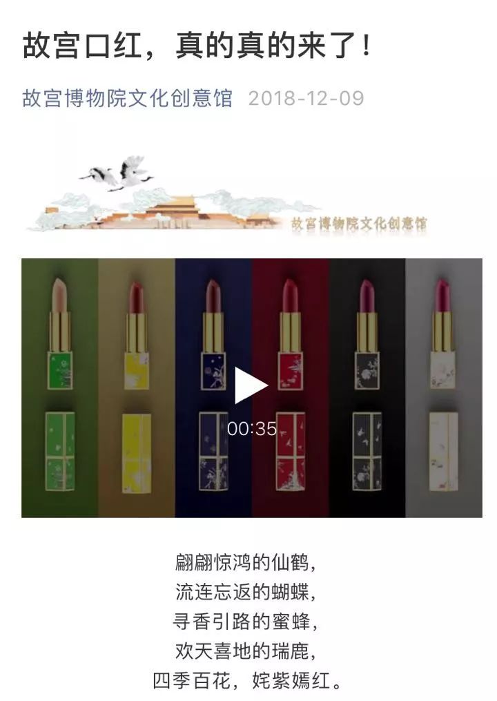 去年12月9日,“故宫博物院文化创意馆”官方微信公众号推送《故宫口红,真的真的来了!》一文,迅速刷屏。很快,“故宫淘宝”立即否认:目前市面上见到的所有彩妆并非我们所设计,还另外声明“故宫淘宝”的“原创彩妆”周二发布。11日上午,“故宫淘宝”就将该微博删除,并且回应称:“都是院内官方店铺,但部门、定位、风格不同”。