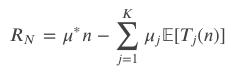 不要被数学公式吓到了,用自然语言描述就是:最理想的情况是 n 次都是均值最大的那个手臂 ( 𝜇∗ ),不过我们并不知道,𝜇𝑗𝔼[𝑇𝑗(𝑛)] 是这个策略下选择第 j 个手臂的期望。那么 R 就是期望的损失,如果我们的策略非常理想,这个策略只尝试最好的手臂,其它不试,那么 R 就是 0。