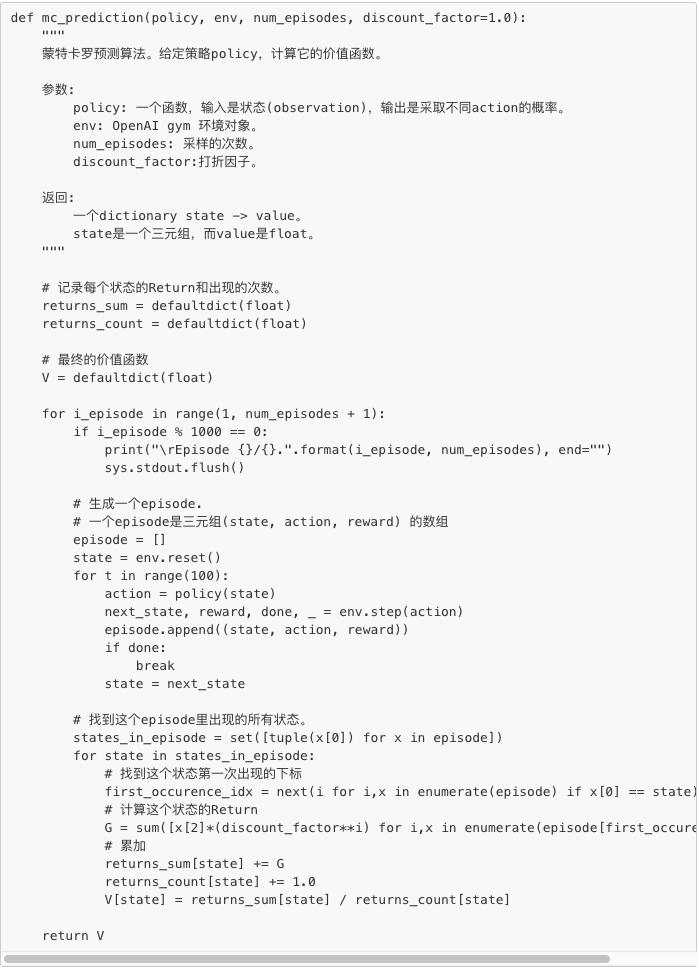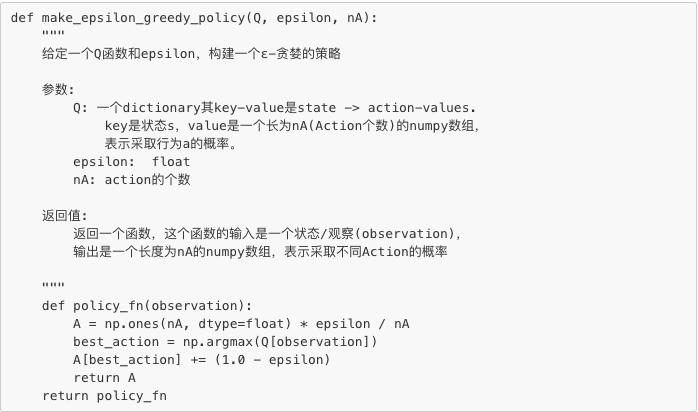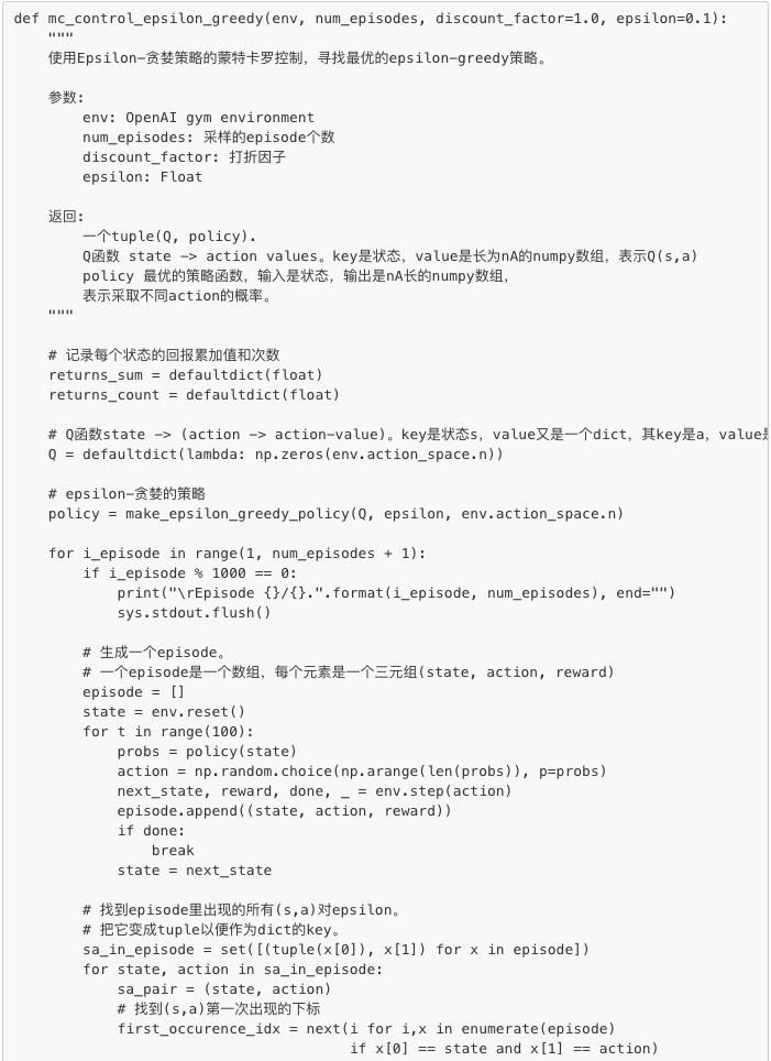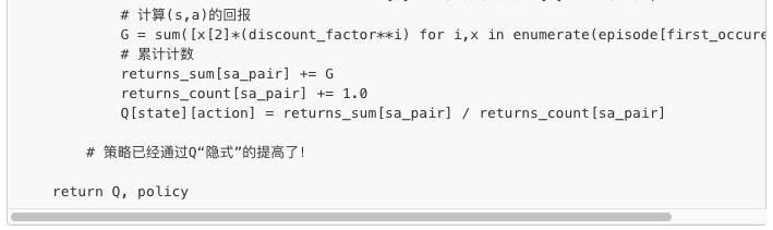 注意和伪代码比,我们没有“显式”定义新策略𝜋′π′,而是把当前策略定义为Q(s,a)的一个函数policy = make_epsilon_greedy_policy(Q, epsilon, env.action_space.n),因此Q(s,a)发生变化时,对于的函数就会发生变化。