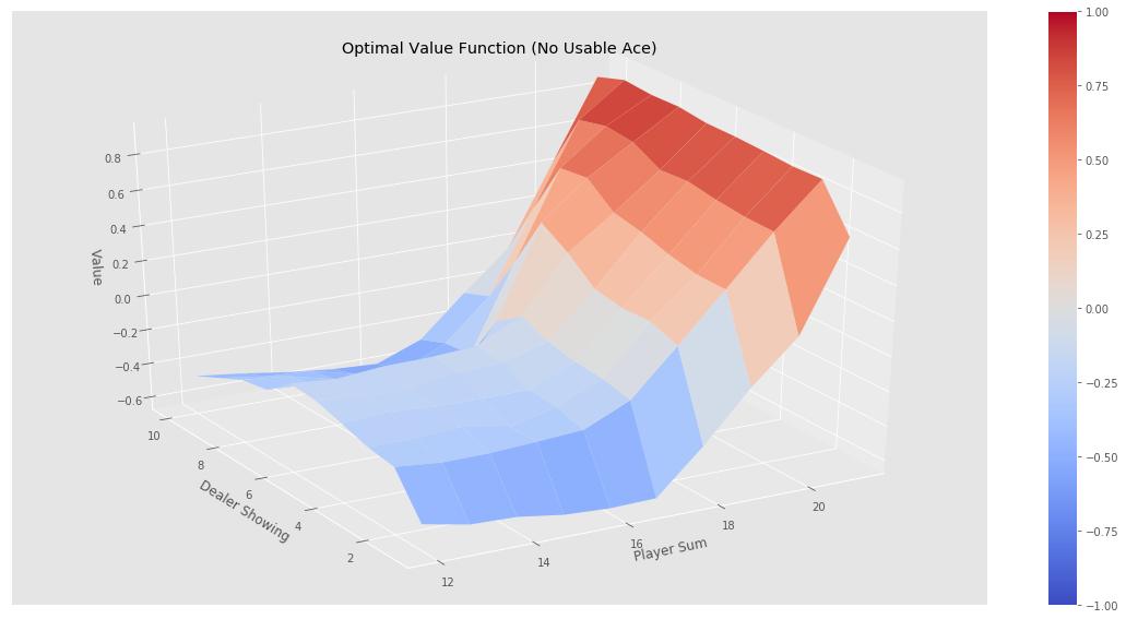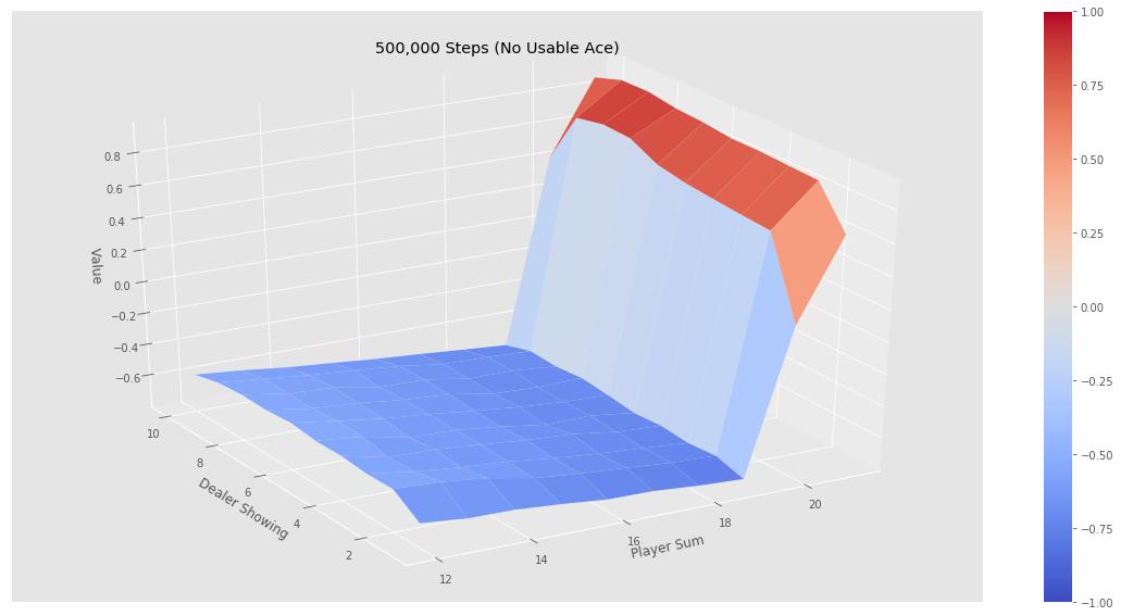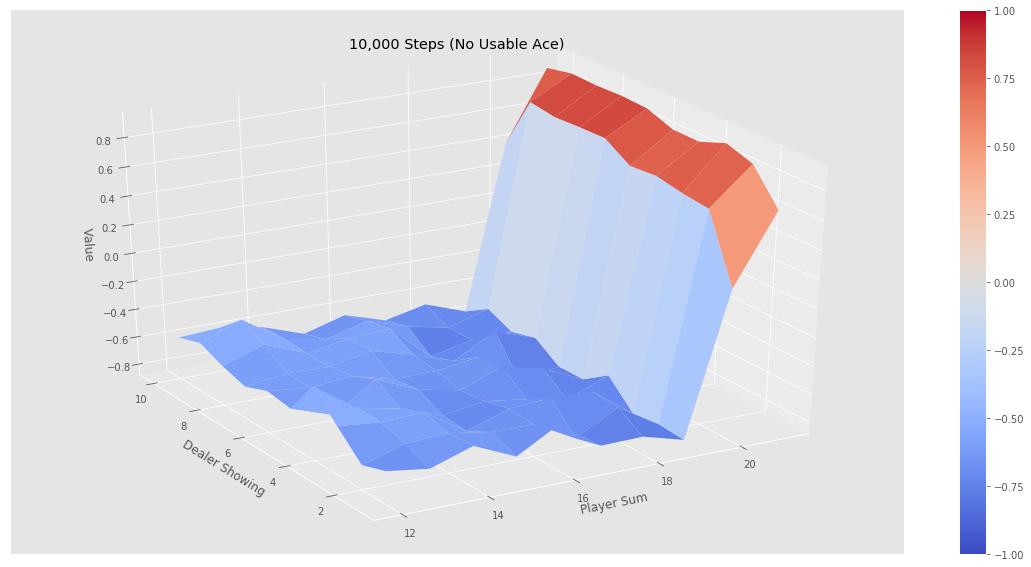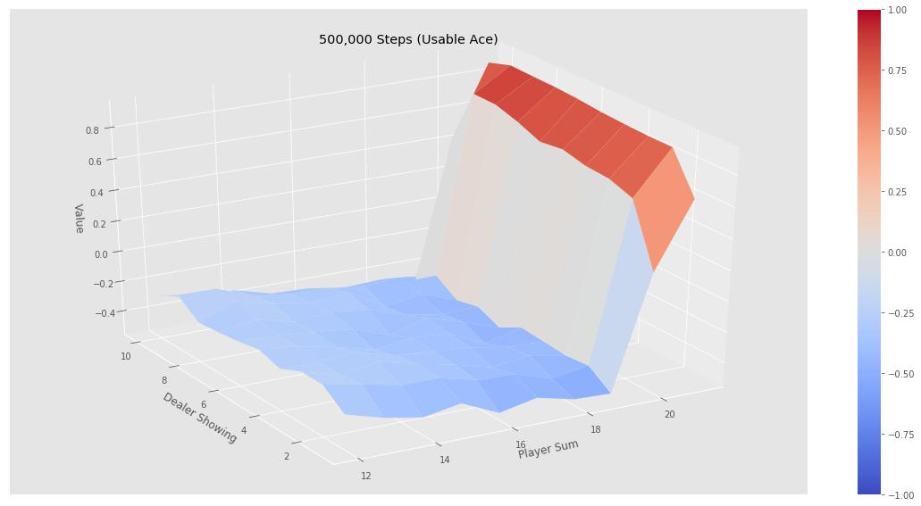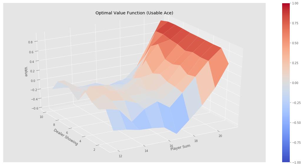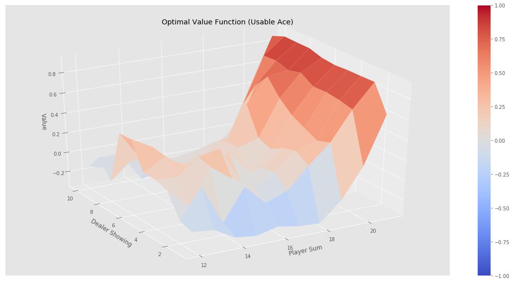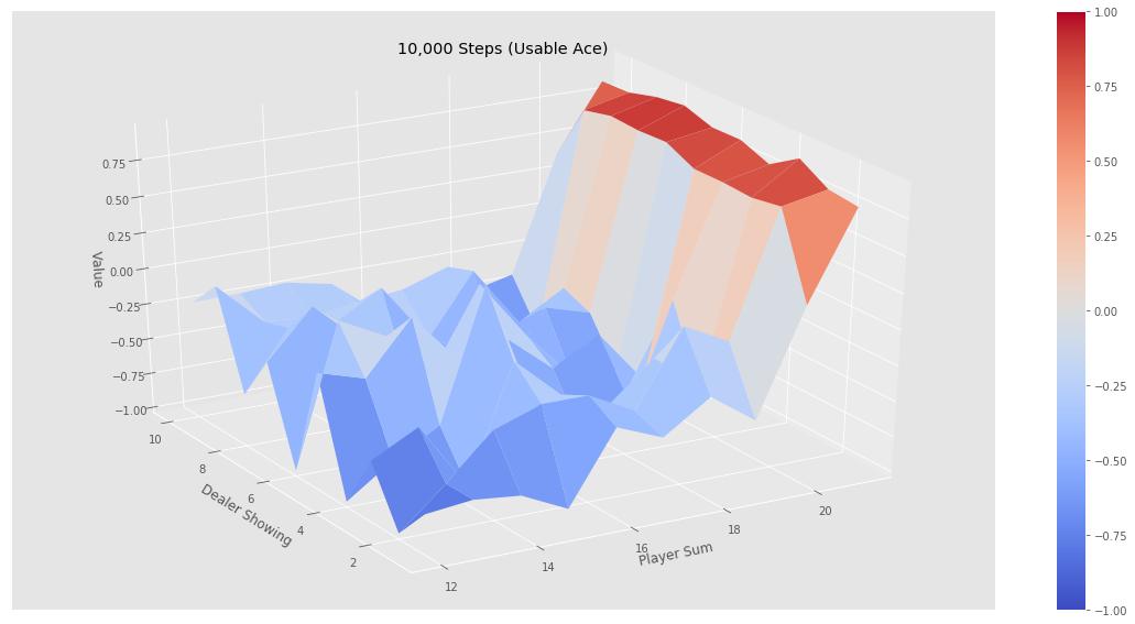 最后我们测试简单的策略——不到 20 就要牌,否则就停止的策略,看看它在不同状态下的价值函数: