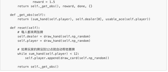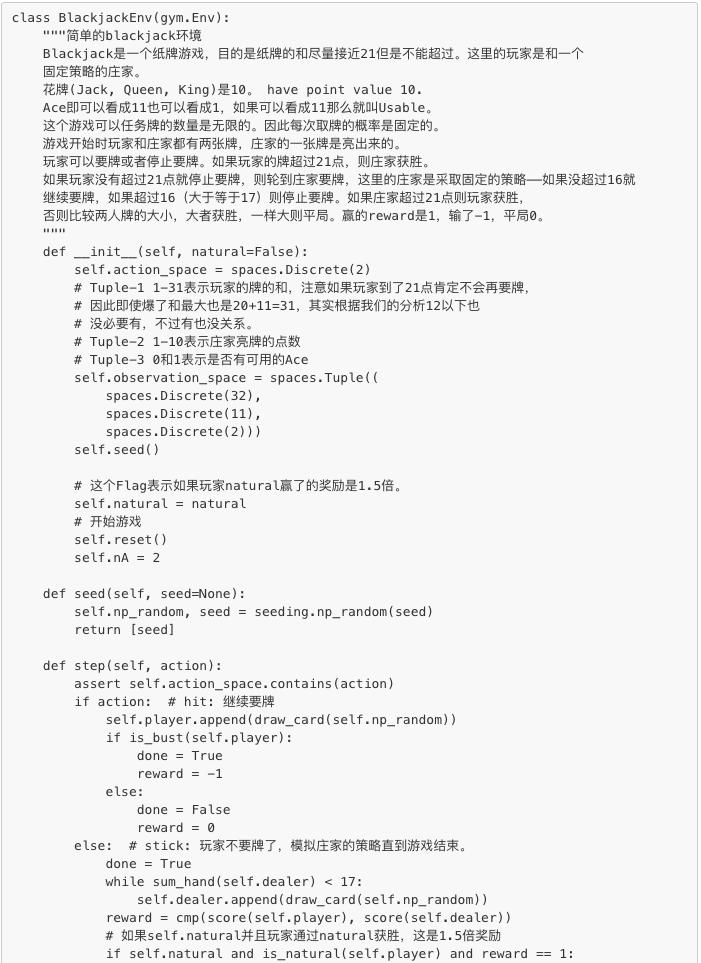 首先我们来简单的阅读一些Blackjack环境代码。代码在 envs/blackjack.py 里。要点都在注释里了,请读者仔细阅读注释。