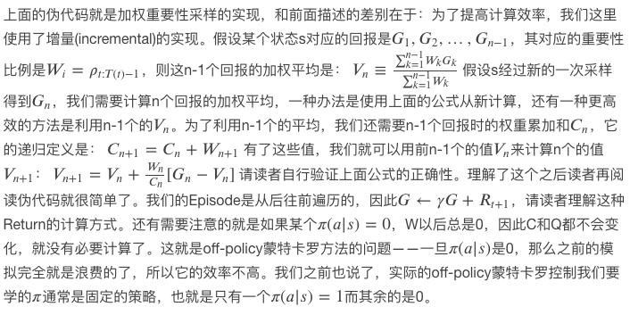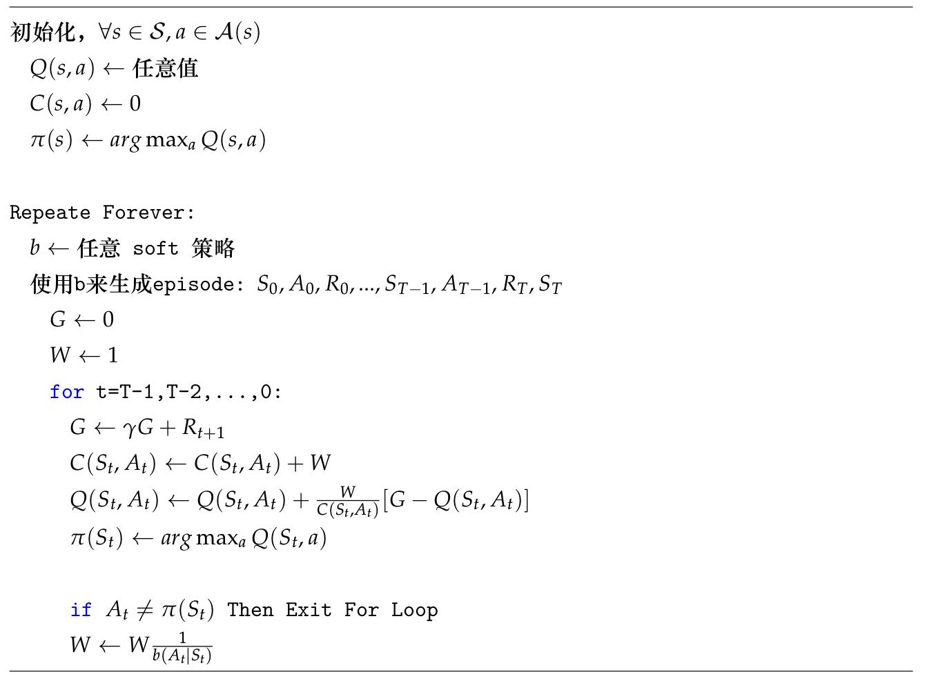 有了 Off-Policy 预测之后,我们很容易得到 Off-Policy 蒙特卡罗控制。伪代码如下: