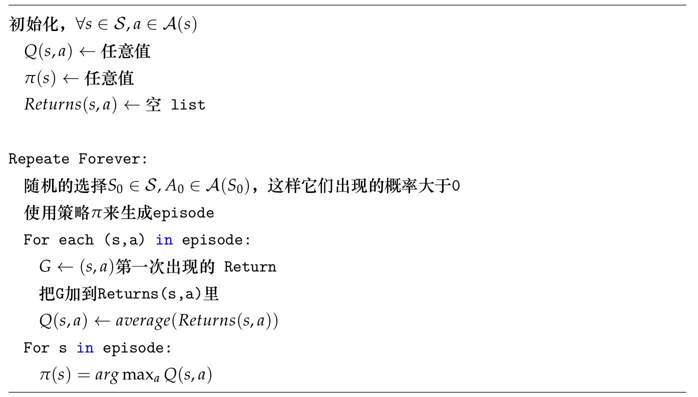 这个算法有两个假设:蒙特卡罗迭代的次数是无穷的(才能逼近真实的价值函数);Exploring Start。前者我们可以忽略,因为迭代足够多次数一般就够了,而且我们之前也讨论过价值迭代,我们不需要精确的估计策略的价值就可以使用价值提升了。这里的关键问题是 Exploring Start,初始状态 𝑆0 因为游戏是随机初始化的,因此所有可能的初始状态我们都可能遍历到,而且随着采样趋于无穷,每种可能初始状态的采样都是趋于无穷。与 𝑆0 对应的 𝐴0 可能有很多,但是有可能我们的策略会只选择其中一部分,那么有可能我们搜索的空间是不完整的。一种办法就是Exploring Start,就是强制随机的选择所有可能的(𝑆0S 和𝐴(𝑆0) ),但这样有问题——我们的策略探索过 (𝑆0,𝐴0) 之后发现它不好,正常的话,它碰到𝑆0S0后就避免 𝐴0 了,但是我们强迫它随机(平均)的探索 (𝑆0,𝐴0) 和 (𝑆0,𝐴1) ,其实是浪费的。这个问题我们留到后面来解决,我们首先假设是 Exploring Start 的,看看蒙特卡罗预测的伪代码。