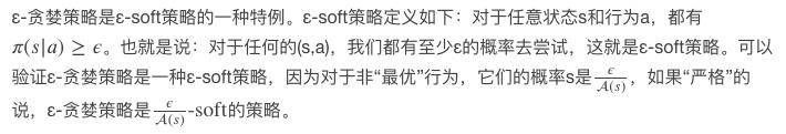 On-Policy 的策略通常是 soft 的,也就是 ∀s∈S, a∈A(s), π(a|s)>0。因此 soft 的策略在状态 s 时对于所有的 Action 都有一定的概率去尝试,但是最终会有某个(些) Action 的概率会比较大从而形成比较固定的策略。为什么蒙特卡罗控制要求策略是 soft 而之前的动态规划不需要呢(还记得之前的策略提升都是用到固定的贪婪的策略吗)?