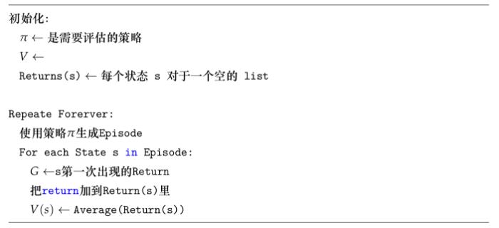 比如我们要估计 𝑣𝜋(𝑠) ,我们用很多 Episodic 的经验,这些经验是使用策略 𝜋 获得的。一个Episode里 s 的每次出现都叫做 s 的一次 visit。当然在一个 Episode 里 s 可能多次出现,一种方法只考虑 s 的第一次 visit,这就叫 First-Visit 蒙特卡罗方法;而另外一种就是每次 visit 都算,这就是 Every-Visit 蒙特卡罗方法。这两者的收敛在理论上有一些细微区别,我们这里不讨论,这里我们使用 First-Visit 蒙特卡罗方法。算法伪代码如下: