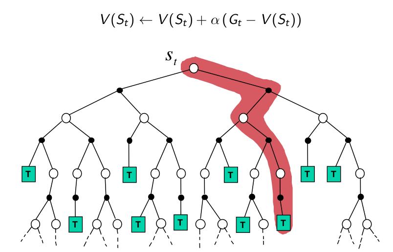 蒙特卡罗方法是 offline 的,需要一个 Episode 结束之后才能计算回报。等介绍过 TD(λ) 之后,与 constant-α MC (一种后面我们会介绍的蒙特卡罗方法)等价的 TD(1) 可以实现 online 计算。这样如果不是 Episode 的任务(比如用于不结束状态的连续的任务),或者有些任务如果策略不对可能永远无法结束,比如后面我们会介绍的 Windy Gridworld。