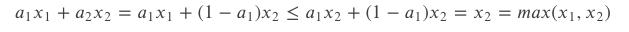 这个证明难点是第二行到第三行的不等式,它利用了这样一个结论:n个数的“线性组合”小于等于最大的那个数。所谓的线性组合就是n个数分别乘以n个系数在加起来,这n个系数是大于等于0小于等于1并且和为1的。我们以两个数为例,假设𝑥1≤𝑥2 :