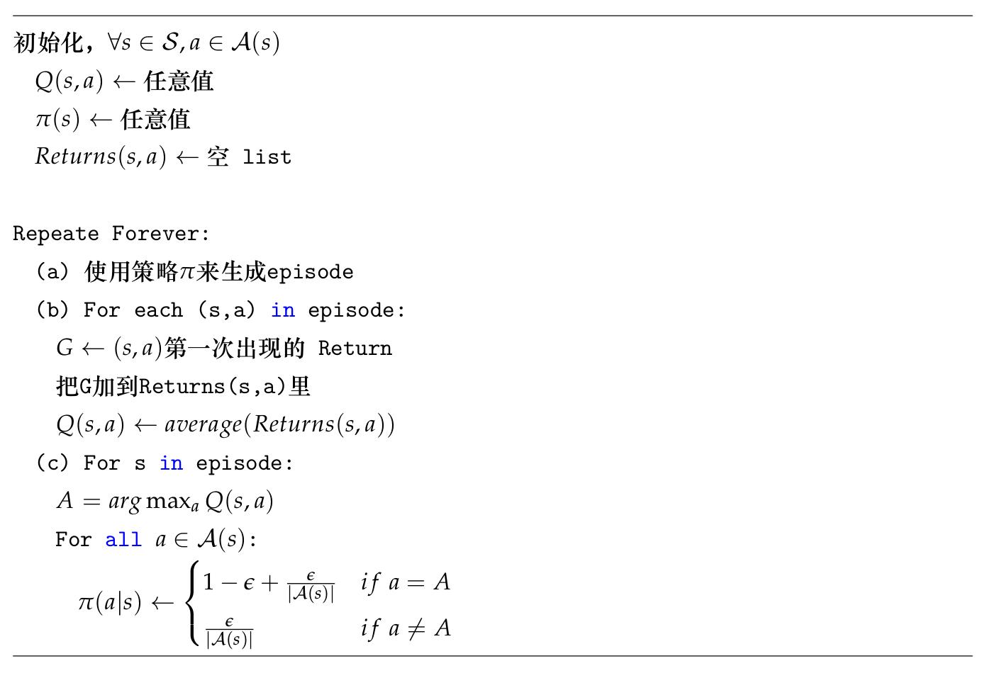 这一节我们会介绍 ε-贪婪算法,它在大部分情况下(1-ε的概率)会使用贪婪的策略选择 a 使得 q(s,a) 最大,但是也会有 ε 的概率随机的选择策略。因此对于“最优”行为的概率是 1-ε+ε/|A|(因为随机也可能随机到最优的行为),而其它行为的概率是 ε/|A|。算法的伪代码如下: