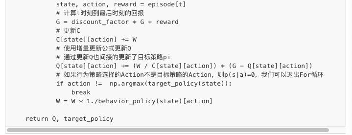注意这个代码和上面代码最后两行的差别。首先因为我们的策略 𝜋 是确定的策略,因此只有一个Action 的概率是 1,其余的是 0。因此如果状态是 𝑆𝑡 ,那么策略 𝜋 会选择 Q 最大的那个 a,也就是 𝑎𝑟𝑔max𝑎𝑄(𝑆𝑡,𝑎) ,如果 𝐴𝑡≠𝜋(𝑆𝑡) ,则说明 𝑝(𝐴𝑡|𝑆𝑡)=0 ,因此和上面算法的条件一样,可以退出 for 循环,否则就更新 W,如果执行到最后一行代码,说明 𝑝(𝐴𝑡|𝑆𝑡)=1 ,所以分子是 1。