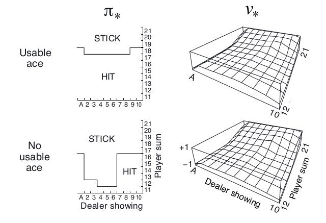 玩家的状态有多少种呢?首先是自己的当前得分,因为如果当前不超过11点,那么必然可以要牌而不爆掉,因此状态是12-21共10种可能。而另外的信息就是庄家亮牌 ace-10 共十种(花牌和10 没区别)。还有一点就是Ace,如果玩家有一个Ace而且可以把它算作 11而不爆,那么这个 Ace就叫可用(Usable)的 Ace。如果 Ace 算作 11 就爆了,那么它只能算 11,也就是不能再(根据不同情况)变化了,也就不“可用”了。如果Ace可以算11,那么我们一定把它算成11,因为如果算成1,那么分就一定小于等于11(否则就爆了),那么我们一定会继续要牌,这个状态是不需要决策的,直接变成一个新的状态。