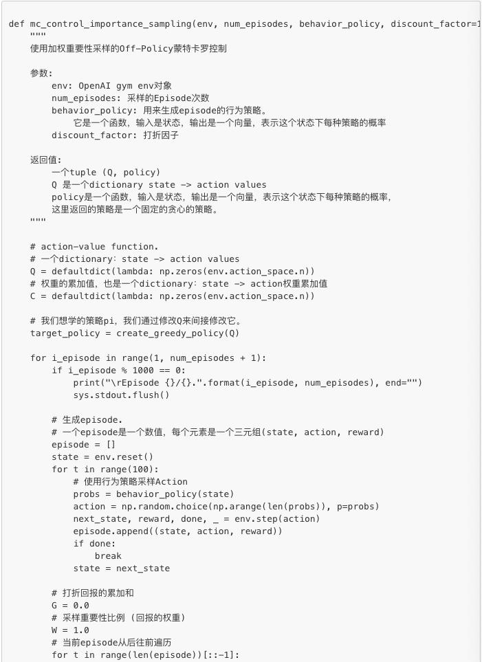 核心的函数是 mc_control_importance_sampling,代码和伪代码几乎一样,请读者参考伪代码阅读: