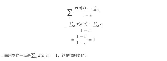 假设策略 𝜋 是一个 ε-soft 的策略,它的行为价值函数是 𝑞𝜋(𝑠,𝑎) ,而 𝜋′ 是对 𝑞𝜋 进行 ε- 贪婪之后得到的新策略(当然它也是一个 ε-soft 的策略),那么这个新策略 𝜋′ 相对于 𝜋 是有提升的(新的策略比老的好)。下面我们来证明一下, ∀s∈S,我们有: