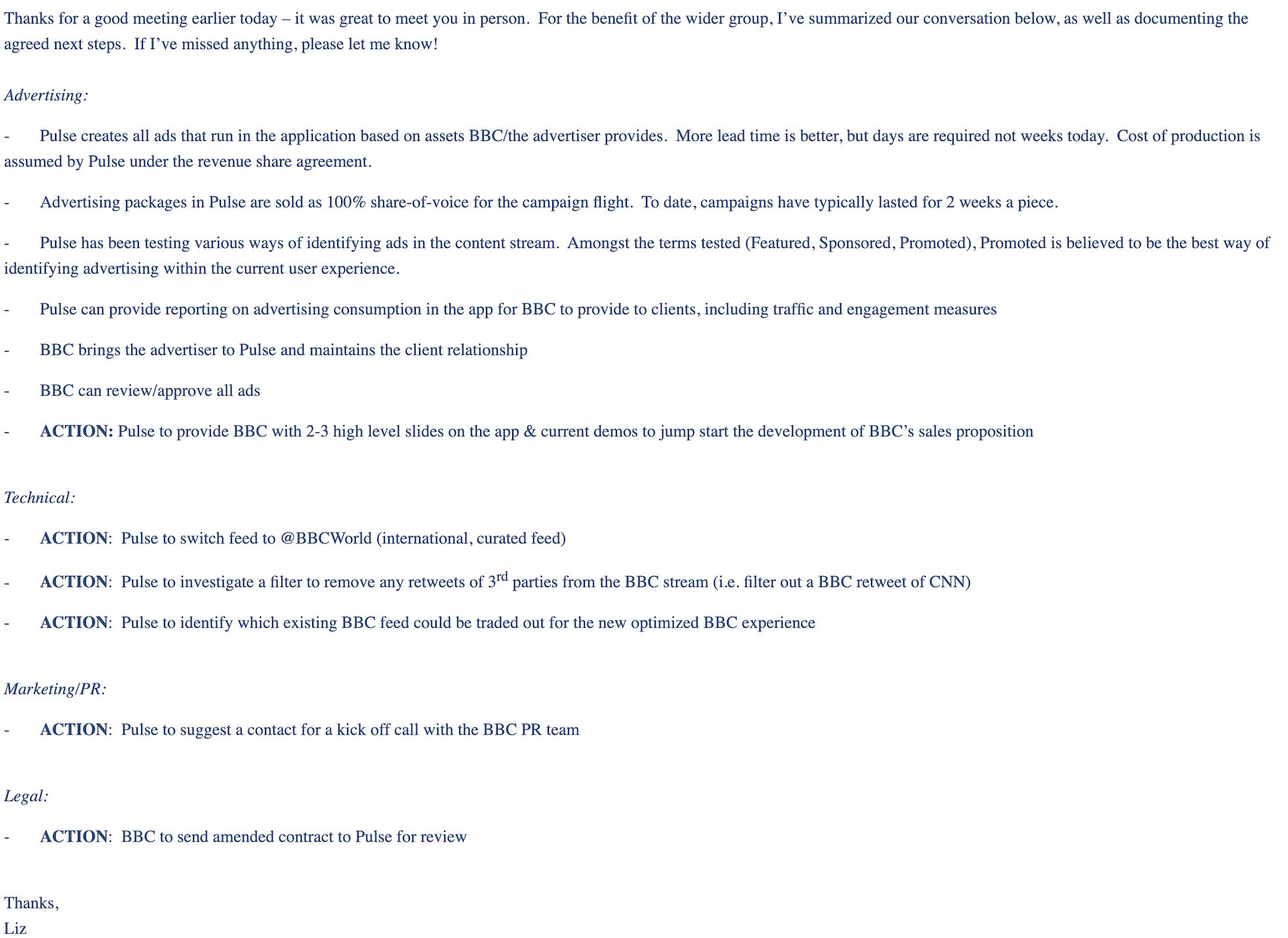邮件中,BBC的那位女士首先对之前的会谈经历表达了自己的看法,同时针对会谈内容和下一步行动形成了书面内容。具体而言,信中将这些内容分为了广告、技术、营销与公关、法律等四个部分,并相应做出了总结和下一步行动计划。
