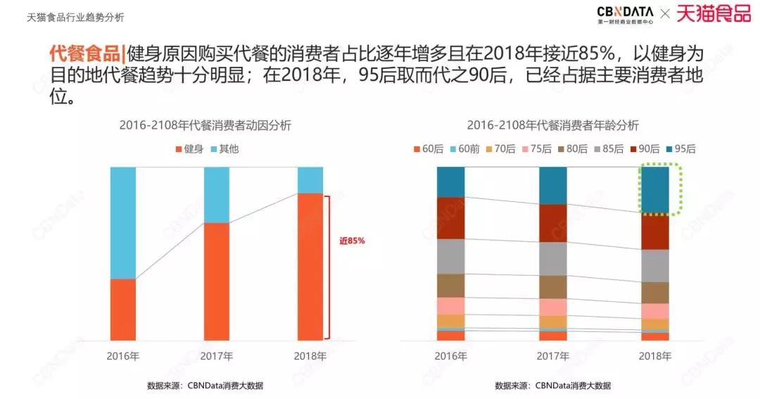 在CBNData的报告中,天猫低糖食品的销售额在2018年都有近一倍的增长,在人群上,90和95后已经成为主力消费趋势。在熬夜和脱发的焦虑之下,需要健身锻炼,更需要低糖等健康饮食来缓解身体健康焦虑。