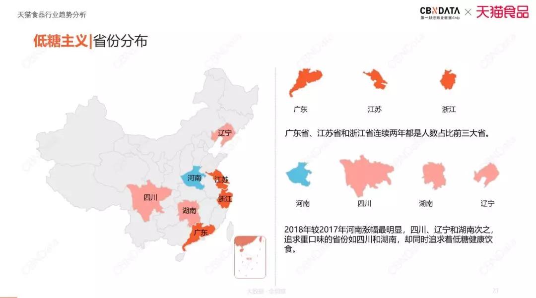 值得一提的是,在消费的城市区域中,广东江苏和浙江是消费最高的三大省份,除了城市人口本身基数庞大的原因之外,少盐/少油的清淡饮食习惯,或许是这三个省份饮食低糖主义开始流行的原因之一。