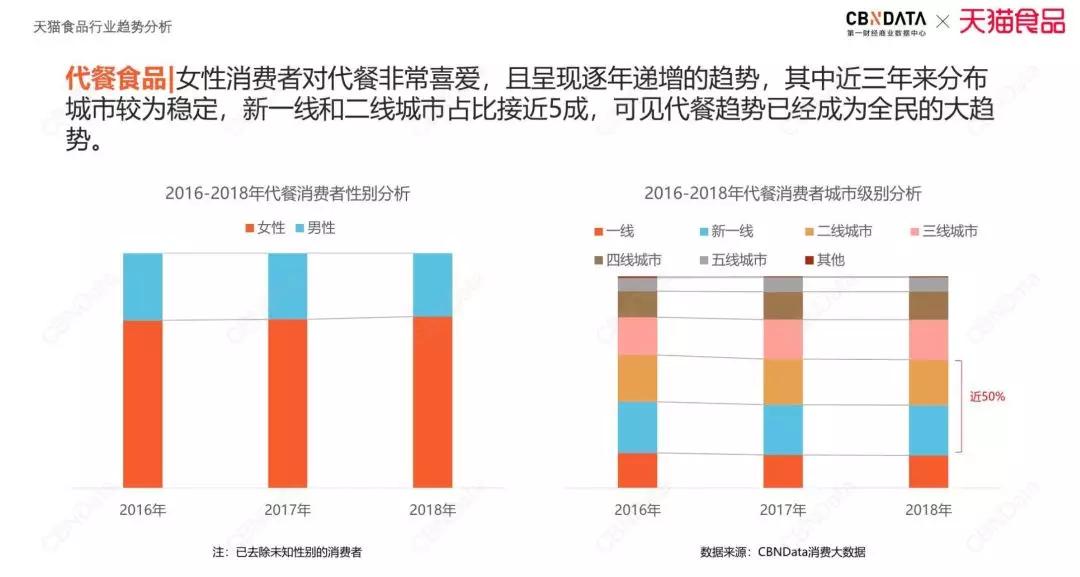 报告显示,不论从销售体量还是消费者人数上,代餐食品都呈现出大于50%的增长率,而其中,女性和健身者是消费的主要群体,并且不难得出,这类人群都聚集在新一线和二线城市,占到近50%的比例。