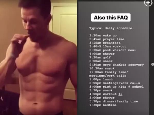 按照菜单中的安排,马克·沃尔伯格每天凌晨两点半起床,进行15分钟左右的冥想祈祷,3点40分开始健身,7点半进行高尔夫球练习,下午4点又开始新一轮健身,期间进行一轮冷疗,每晚7点半上床睡觉,每天要吃4顿正餐和3顿加餐。