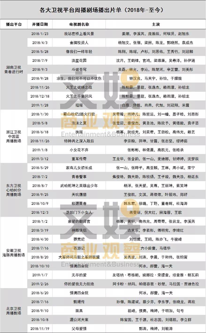 从目前正在播出的几部周播剧来说,现在市场上周播剧的体量都相对较小,文娱商业观察整理了自2018年以来部分卫视周播剧场的播出片单,从中可以看出当前国内卫视平台周播剧的一些规律。