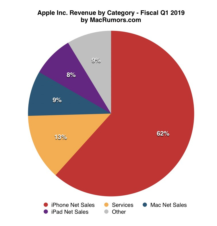 苹果2019财年第一季度各项业务收入分布饼状图。其中,互联网服务占比13%,仅次于iPhone销售、排名第二,其它可穿戴设备、家居及配件销售占比9%。数据及图片来源:macrumors.com