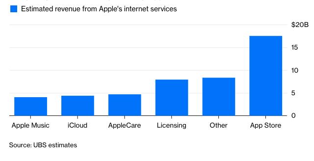 根据瑞银集团(UBS)预测数据显示,苹果的互联网服务业务营收中,核心收入主要来自于App Store,远远高出其它几项营收;而Apple Music收入占比最低。数据来源:UBS