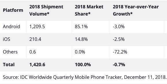 2018年全球范围内智能手机出货量、市场份额以及同比增长率数据。其中,iOS设备市场份额仅占14.8%。数据来源:IDC